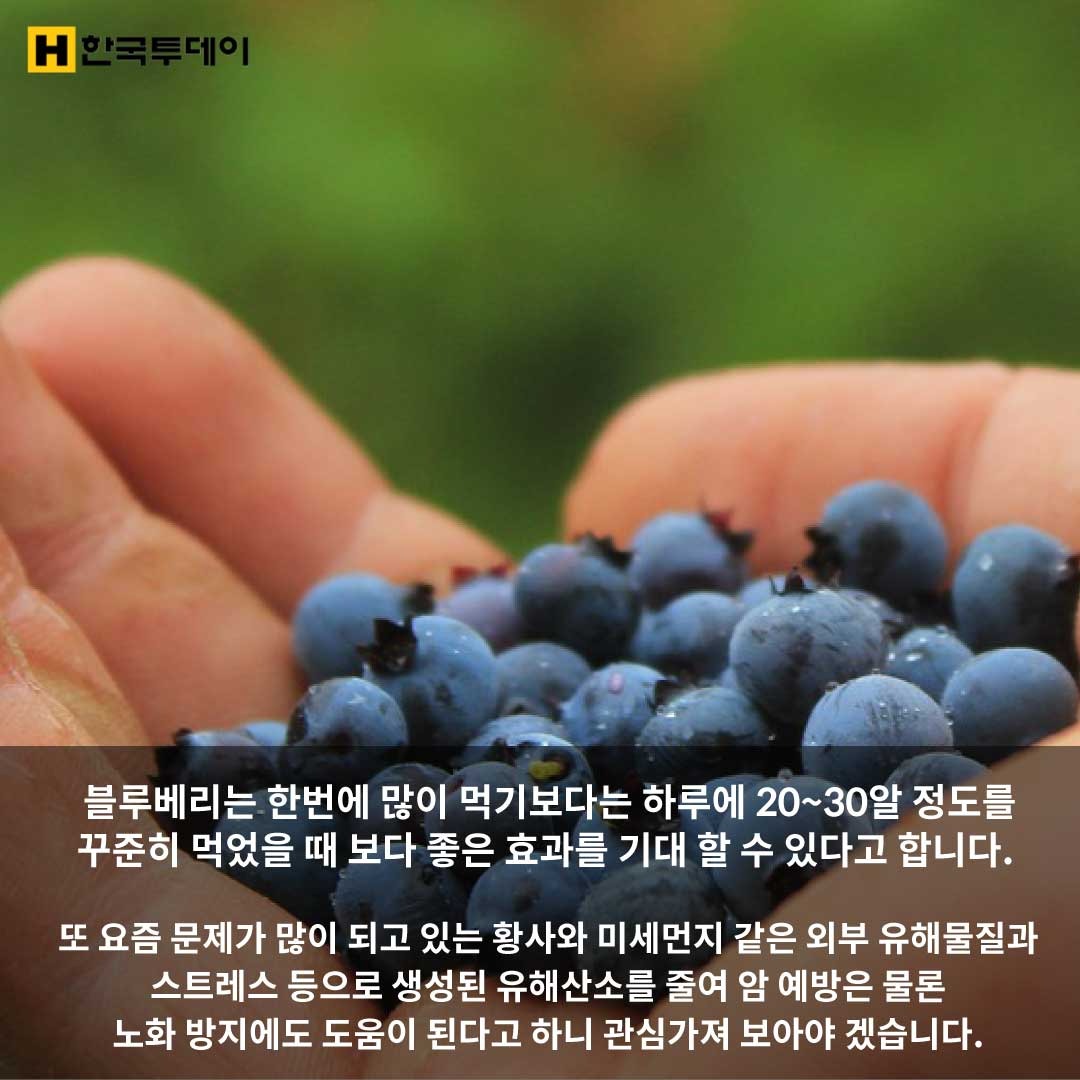 하루 40g(20~30개) 정도 또는 하루 한 컵(150g)의 블루베리를 섭취하는 것이 효과적입니다. 꾸준히 섭취할 때 가장 효과가 좋으므로 매일 섭취하는 것을 권장합니다.