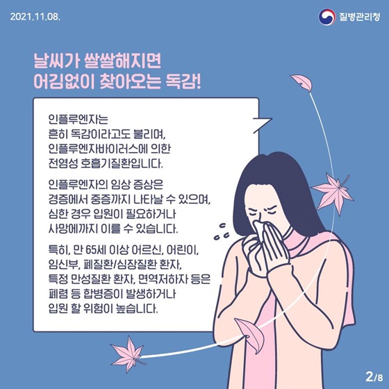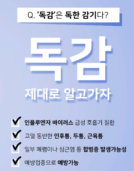 - 독감 예방접종: 매년 10~11월에 접종 권장(4월까지 효과 지속)